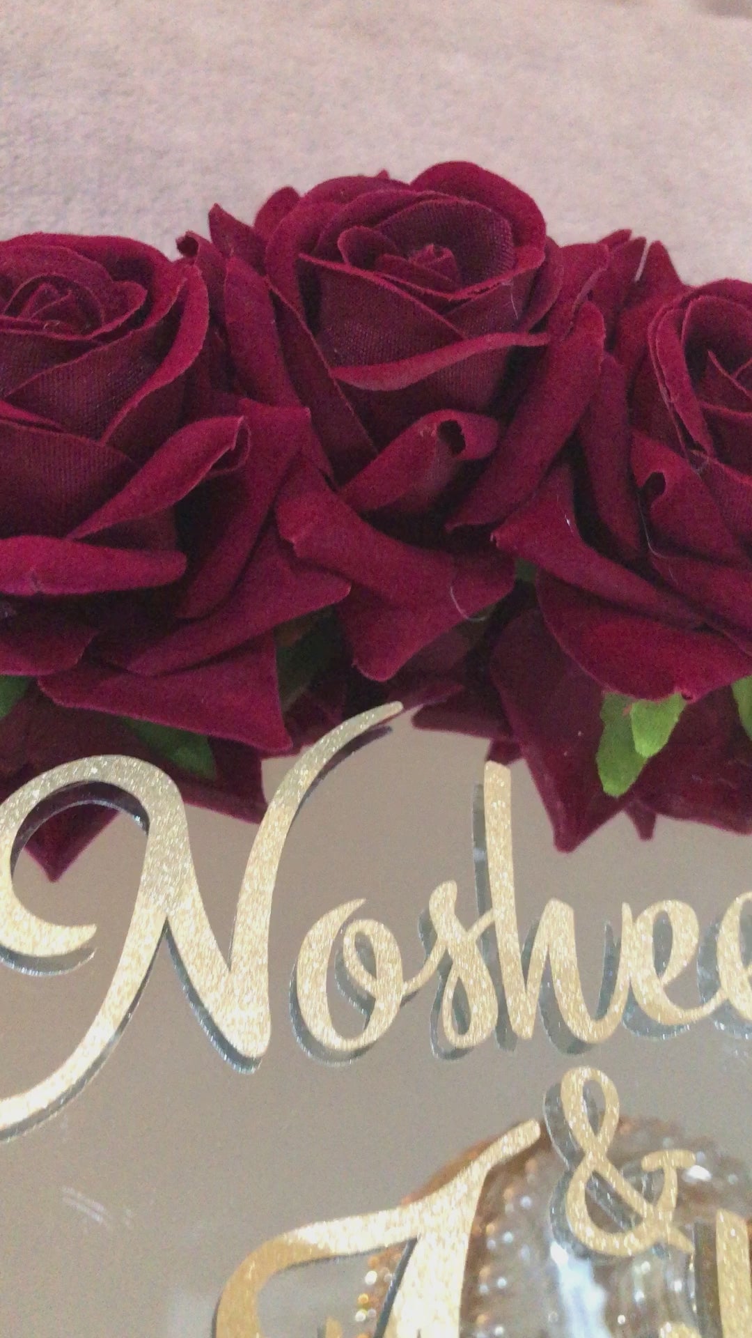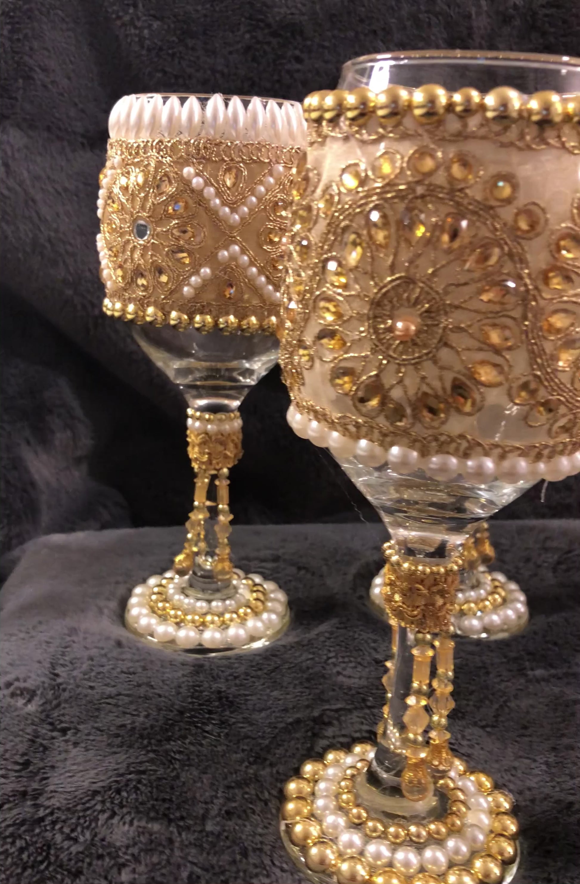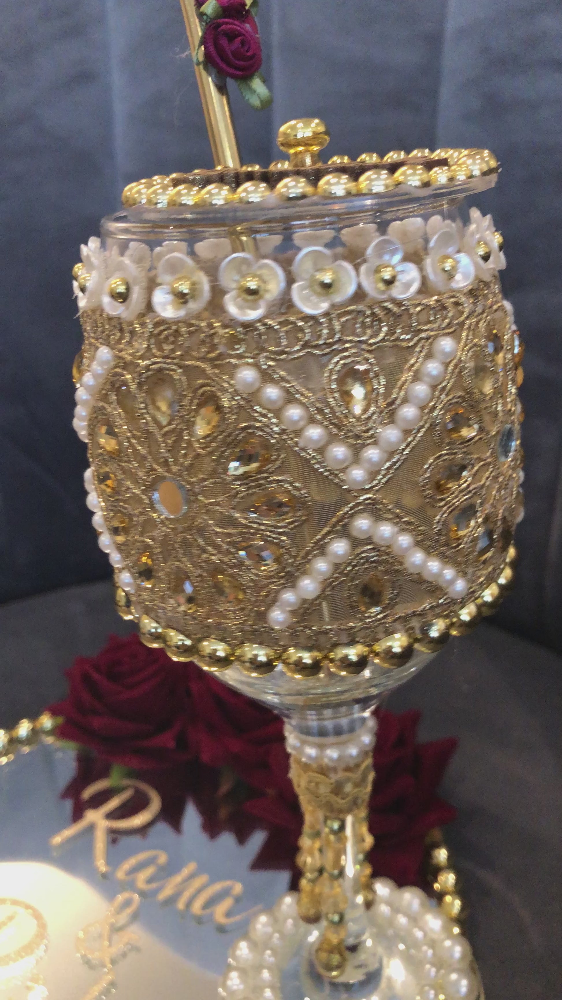 ..Wedding Doodh Pilai Glass Set.Wedding Glass.This Doodh Pilai Glass Set can be used for traditional milk ceremony at Muslim Wedding.Includes a selection of additional accessories to add to the Doodh Pilai Glass Set as you desire.You will receive an embellished Doodh Pilai Glass Set.A lid for the glass which is embellished with gold pearls and a gold bismillah text.A 20cm mirror Tray with burgundy fabric roses which can also be personalised if requested.A gold metallic straw embellished with miniature roses.A straw cleaning brush.Set of pre selected glass charms engraved with Islamic text/wedding quote with your order to place around the base stem of your glass.A cluster of clear acrylic crystal gems to add to your tray as you wish.5cm acrylic gold mirror heart engraved with the text “And we created you in pairs 78:8” & a 5cm acrylic circular gold mirror engraved with the Ayat.The Doodh Pilai Glass Set is a thoughtful keepsake Islamic gift.The Doodh Pilai Glass Set glass is embellished with Ivory & gold flat back pearls and an appliqué embellishment. An Acrylic transparent lid embellished with white flat back ivory pearls & Bismillah text.We use permanent gold shimmer vinyl to create the text for the Doodh Pilai Set tray.The mirror tray is 20cm diameter and embellished with flat back ivory pearls.Milk Ceremony Doodh Pilai Glass Set.Muslim wedding Doodh Pilai Glass Set.Wedding Glass.Shaadi Doodh Pilai Set.Wedding Glass.Nikkah Doodh Pilai Glass Set Wedding Glass.Handmade Doodh Pilai Set.Wedding Glass.Bride Doodh Pilai Glass Set Wedding Glass.Anniversary Doodh Pilai Glass Set.Wedding Glass.Gold Doodh Pilai Glass Set.Wedding Glass.