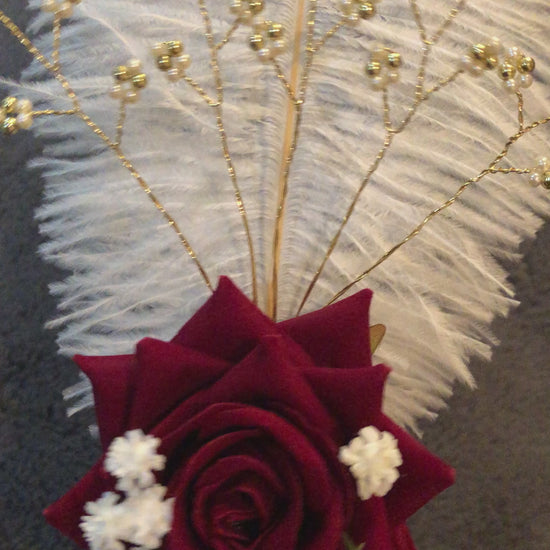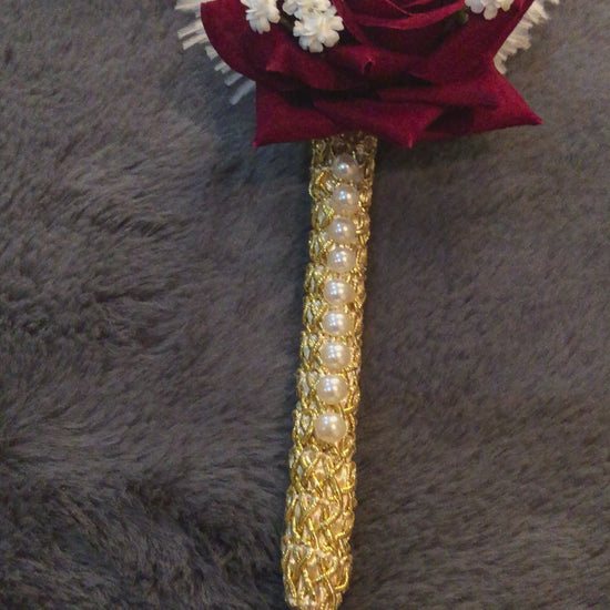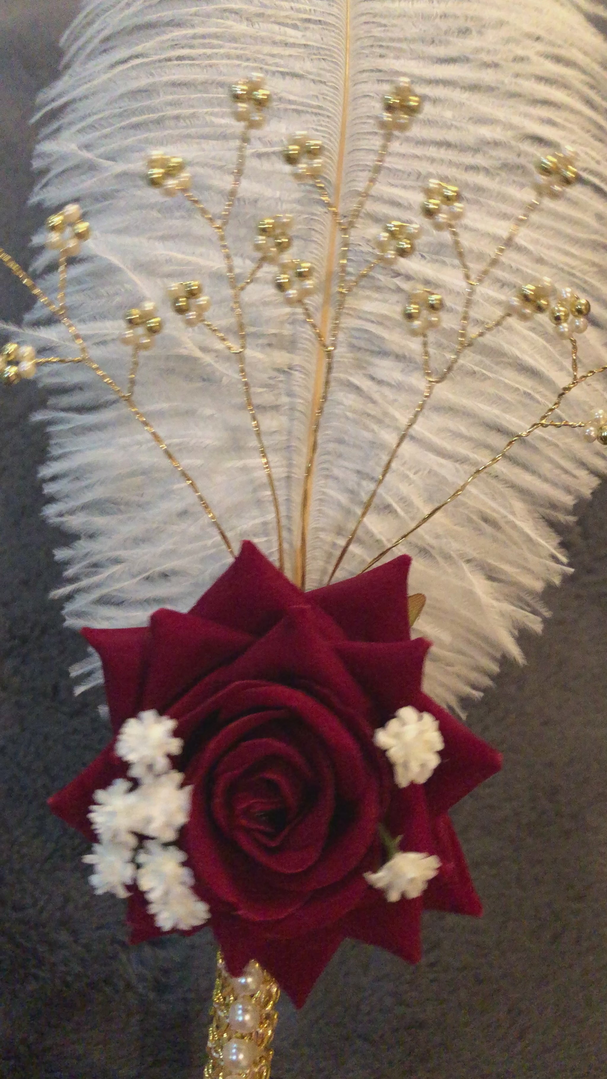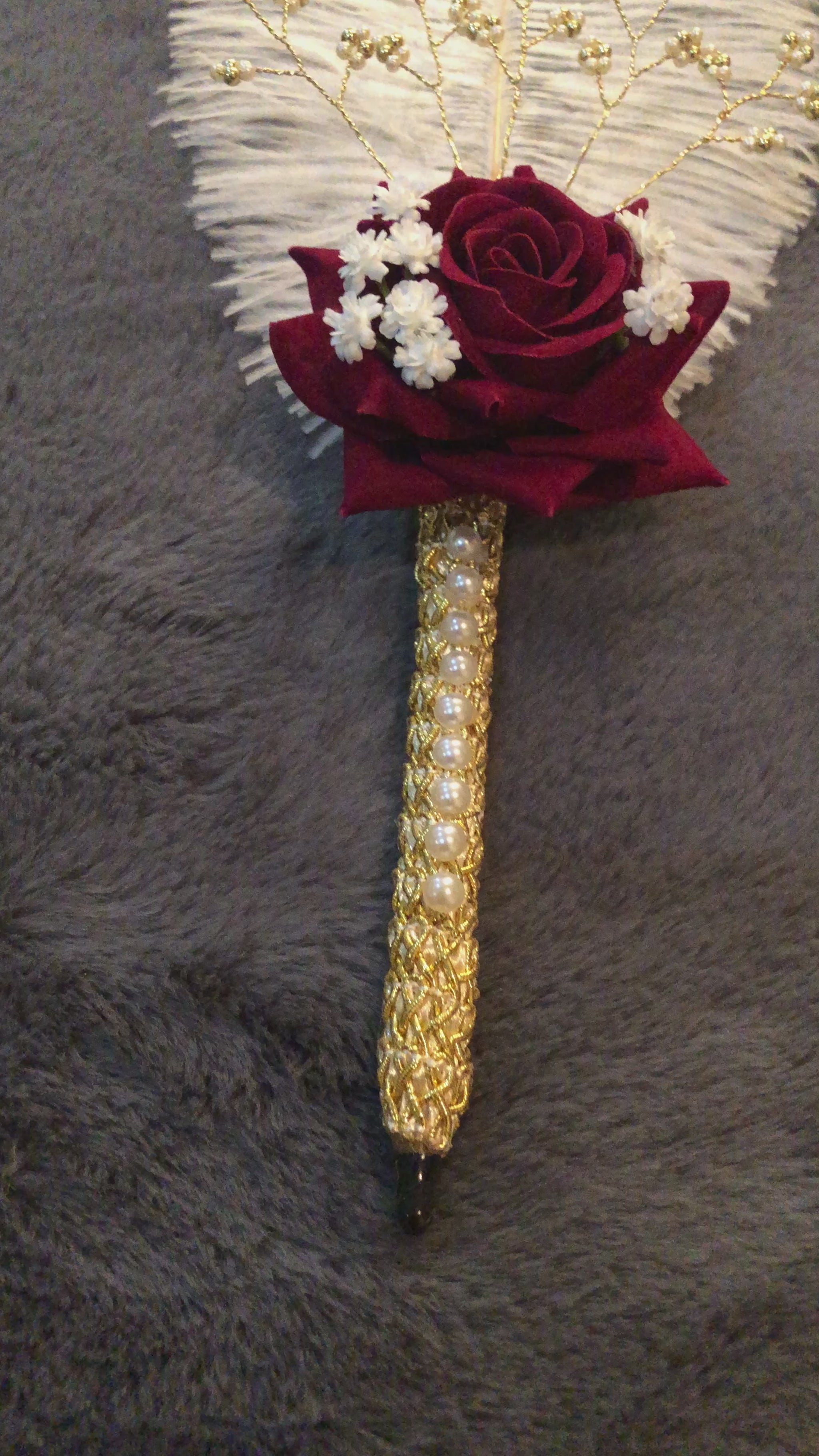 Nikkah Pen.Wedding Pen.Includes additional pen accessories to add to the pen.A set of gold mirror heart pen charms with the engraving, Nikkah Mubarak & Qubool Hai.Also included is a circular gold mirror with an Islamic AYAT engraving. A length of white/ivory ribbon with the one of the mentioned text in metallic gold will also be included.A gold shimmer text of your choice which we will include within your order for you to attach to the pen as you wish.Select text from the drop down box available. Our nikkah pens are approximately between 34cm-35cm in length.The pen is wrapped with a mixed metallic gold shimmer with ivory pearls (which compliments the white ostrich beautifully), fabric trim. Option to exclude the white miniture flowers in the rose available.The ink is black.Gold wired Ivory and gold pearl flower embellishments are placed on the pen on the just in front of the natural ostrich feather.Elegant Nikkah Pen.Wedding Pen. Muslim nikkah ceremony Nikkah Pen.Wedding Pen.