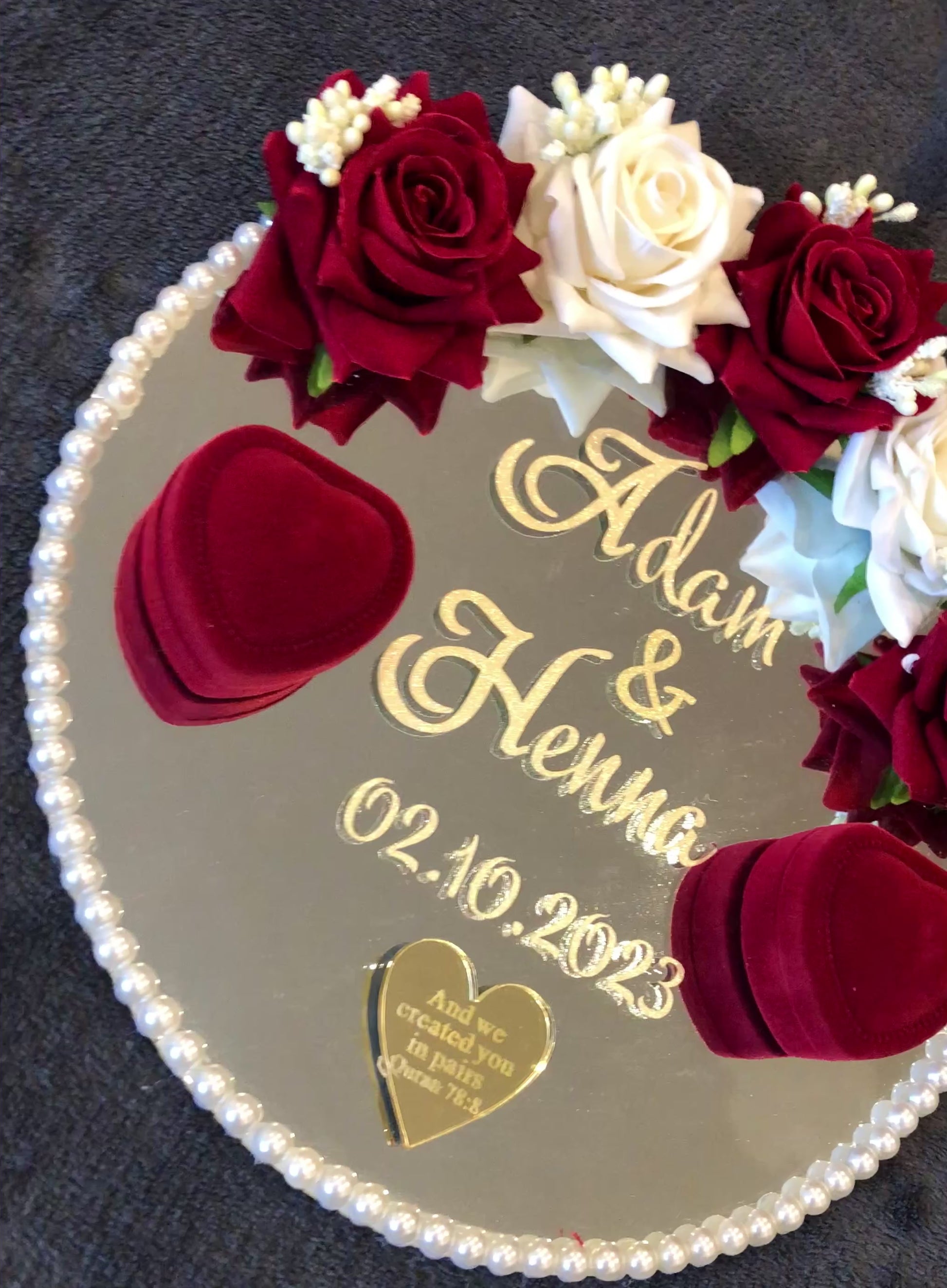 Wedding ring tray.the tray includes additional extras to add to your tray as you wish.Option to personalise is available. A 25cm diameter mirror tray with burgundy and white fabric roses. Includes two velvet burgundy ring boxes,a set of gold mirror acrylic hearts.One engraved with qubool hai the other with Nikkah Mubarak.The ring boxes are not attached to the tray.You will also receive a gold mirror circular embellishment with the ayat (kalma) engraving and a gold heart mirror embellishment with an Islamic quote.Last in stock.No return on personalised sale items. The item style you receive will be the item as shown in the pics.