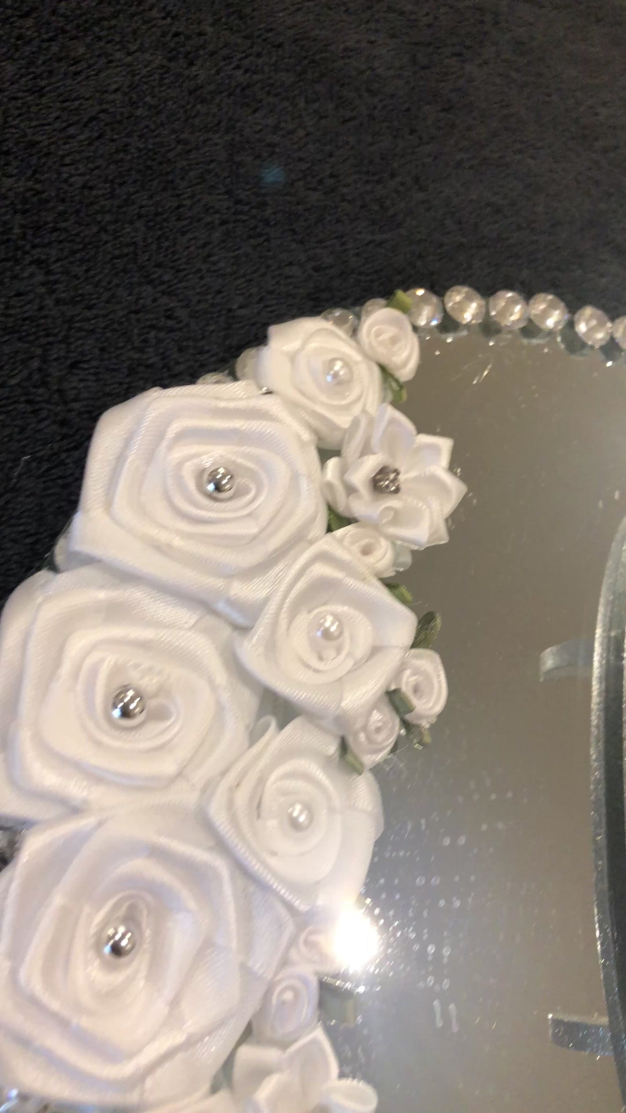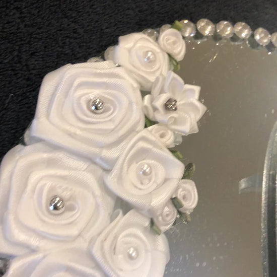 A decorative mirror tray for you to display your wedding or Nikkah pen.Available in two colours,ivory or white. The tray is embellished with a varied design selection of white or ivory satin roses with clear gems around the perimeter of the silver tray option & ivory flat back pearls around the perimeter of the ivory design option.The tray is 20cm in diameter.The actual display is a silver or gold shimmer display depending on your colour choice.*PEN SOLD SEPARATELY.Wedding Pen Display for nikkah pen.Islamic Wedding Pen Display gift.Silver Wedding Pen Display.Luxury Wedding Pen Display for bride.Gold Wedding Pen Display.Flower Wedding Pen Display holder.